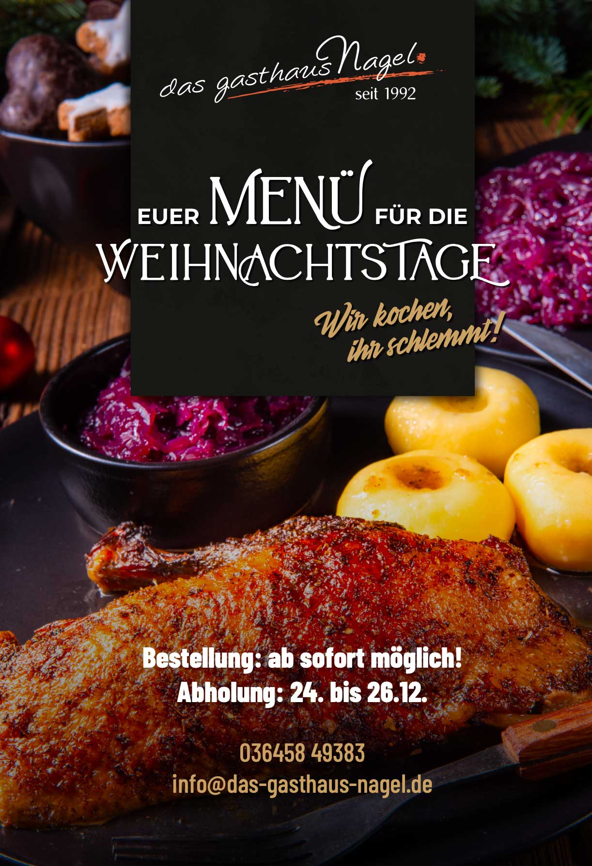 Sparen Sie sich dieses Jahr lange Vorbereitungszeit zu Hause und bestellen Sie Ihre Weihnachtsgans oder -ente im Gasthaus Nagel.